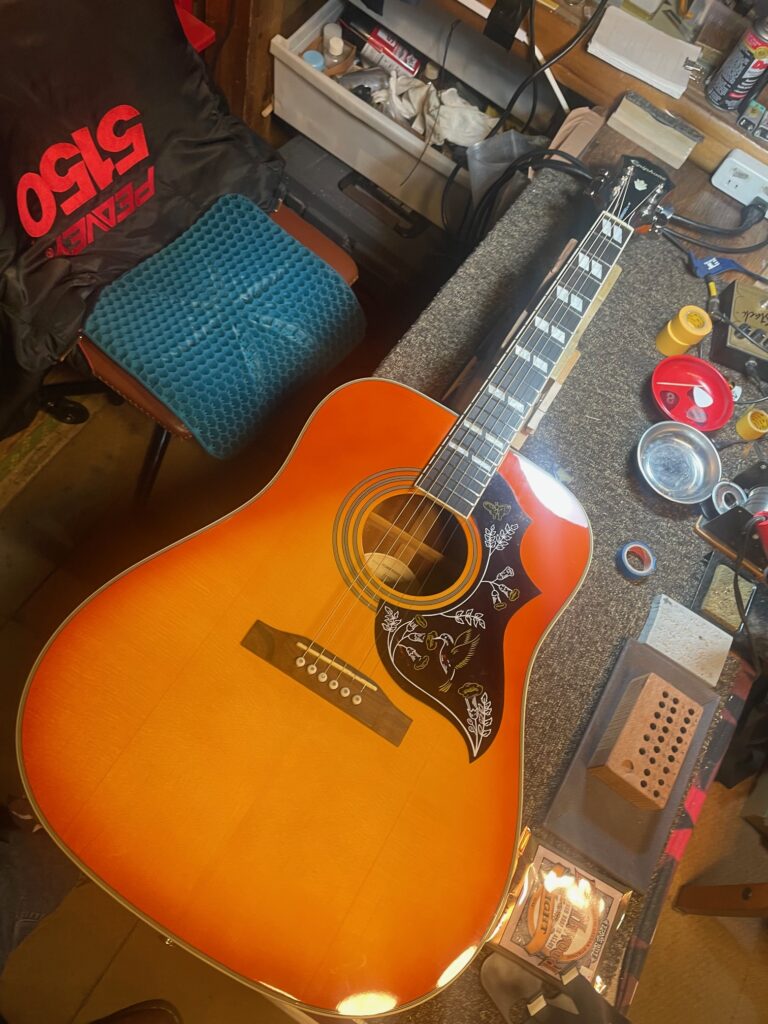 フレットのすり合わせとナットの溝調整をご依頼いただきました。(Epiphone Hummingbird)