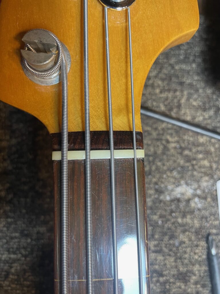 写真はBacchusのJBスタイルのモデルなのですが、ナット交換、ブリッジ交換、アッセンブリ交換(配線材はBELDEN使用)、ネックの指板調整をご依頼いただきました。